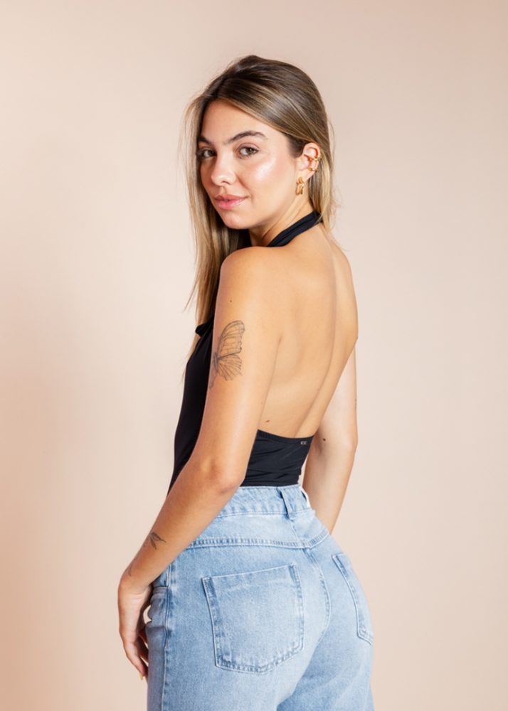 Blusa com modelagem justa ao corpo, gola soltinha e frente única. Confeccionado em 90% poliamida e 10% elastano.