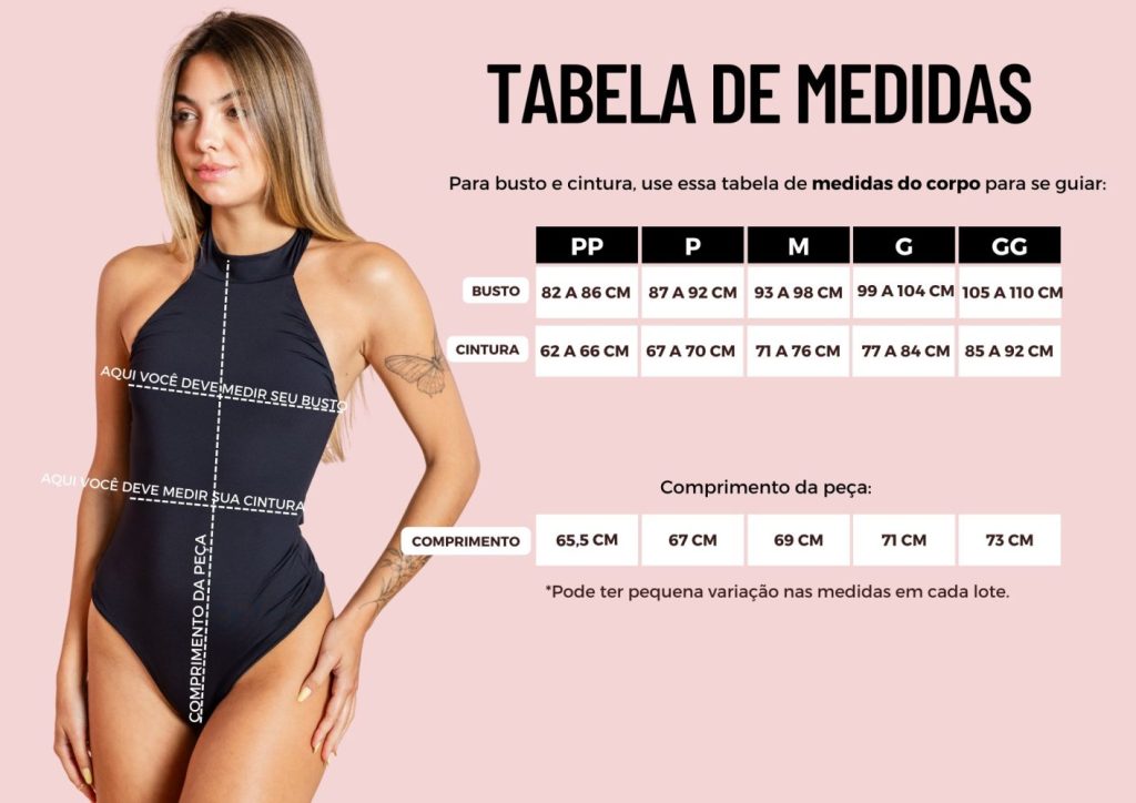 Body com fechamento por botão de pressão, frente única com amarração no pescoço. Confeccionado em 90% poliamida e 10% elastano.