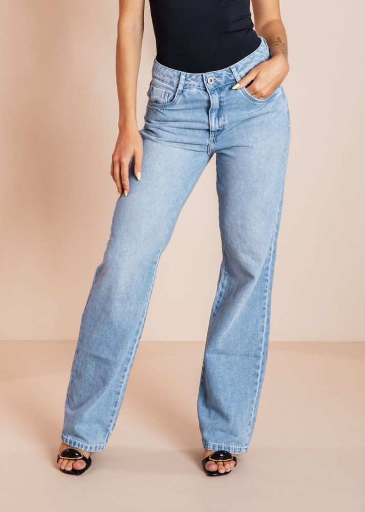 Calça jeans com modelagem solta, gancho médio/baixo e barra com bainha. Possui cós com 5 passantes e o fechamento é por meio de zíper e botao. Na parte traseira, a peça possui dois bolsos. Confeccionada em 100%Algodão.