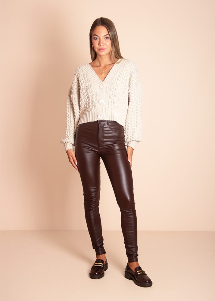A calça é estilo legging, com modelagem ajustada ao corpo e cintura alta. A parte frontal tem três bolsos decorativos e a parte posterior tem dois funcionais. O cós possui cinco passantes e fechamento por botão e zíper. Confeccionada em 75% Viscose 21% Poliamida 4% Elastano.