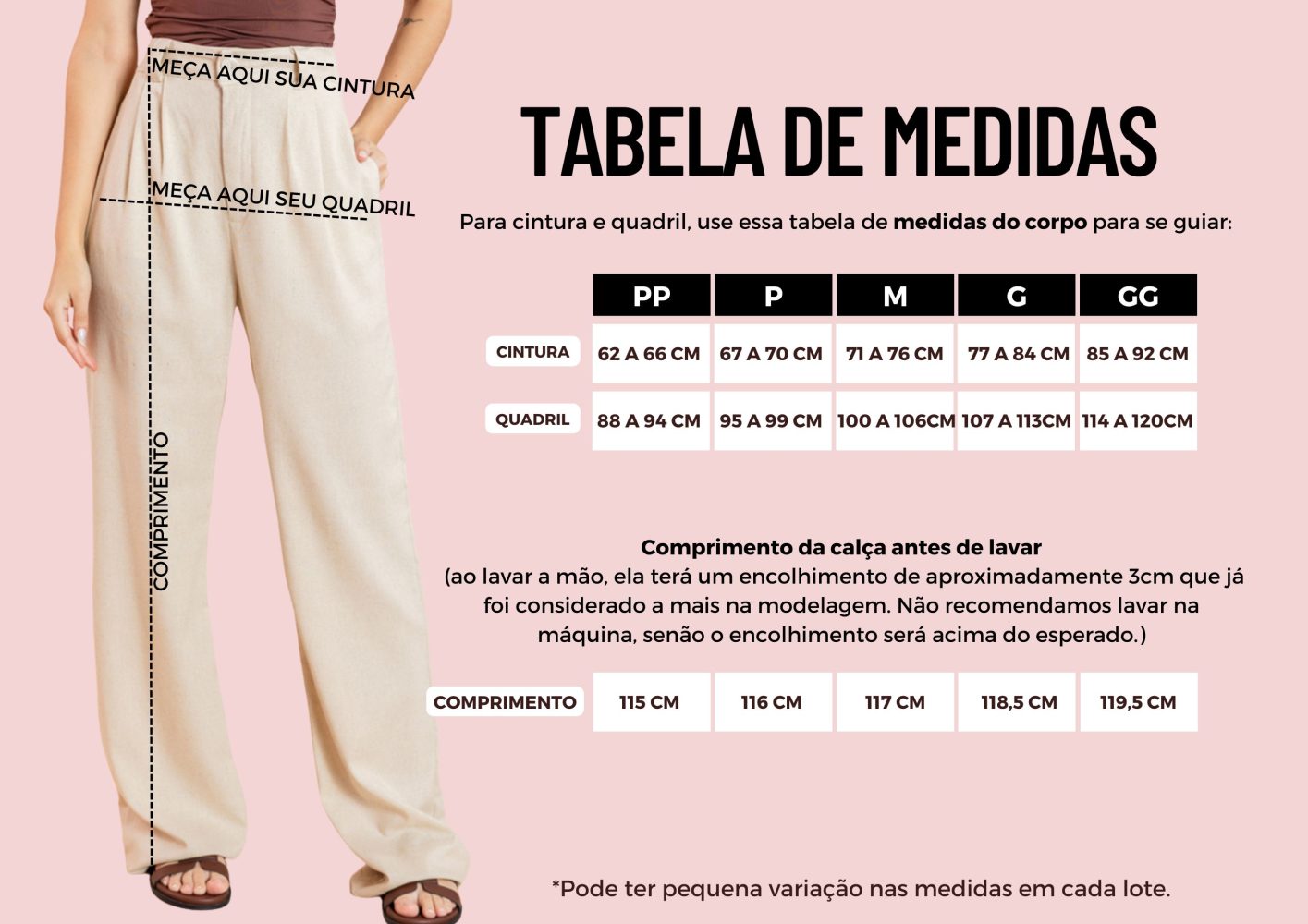 Modelo veste tamanho PP na foto em que a calça está com cintura alta e P na foto em que a calça está com cintura baixa.