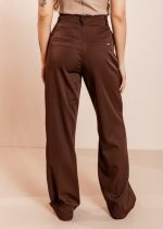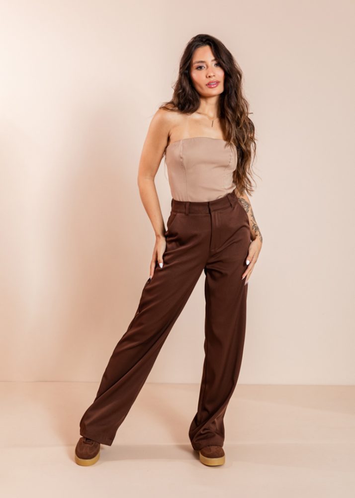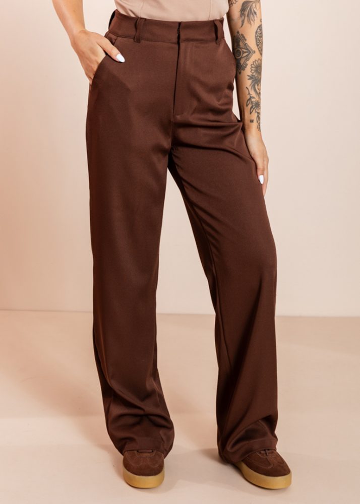A modelagem tem caimento amplo do cós até a barra. O modelo possui cintura alta e a parte frontal tem dois bolsos modelo faca, o cós possui 5 passantes, e o fechamento é através de zíper e botão invisível. Nas costas possui bolsos decorativos. Confeccionada em tecido plano 96%poliéster 4%elastano.
