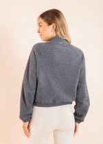 Casaco Bomber em malha plush 71% poliester e 29% viscose, bolsos na frente e fechamento por ziper tratorado.
