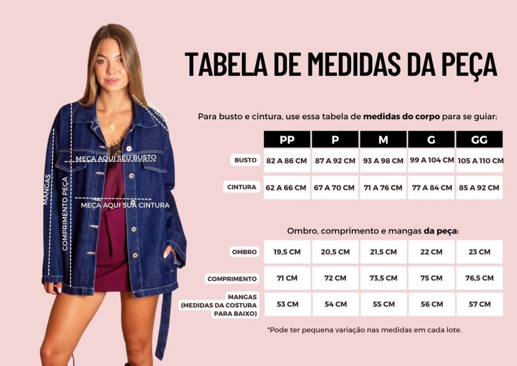 Medidas: Altura: 1,69m. Busto: 80cm Cintura: 64cm Quadril: 94cm.