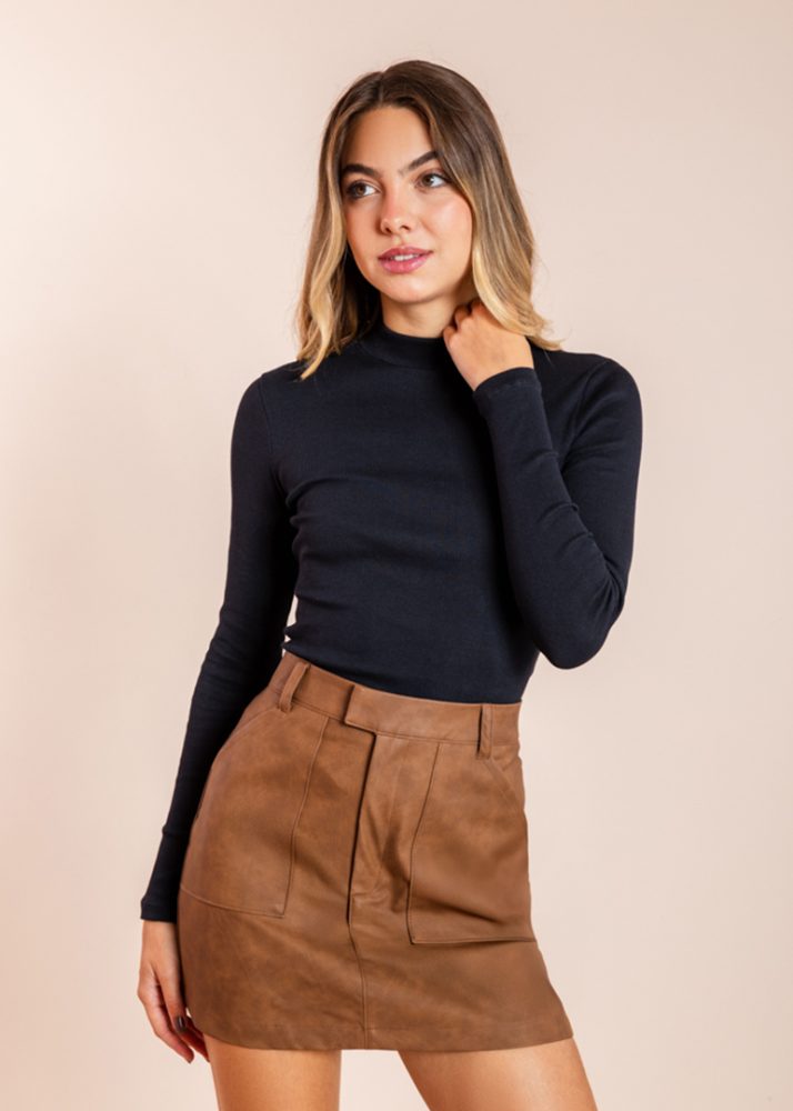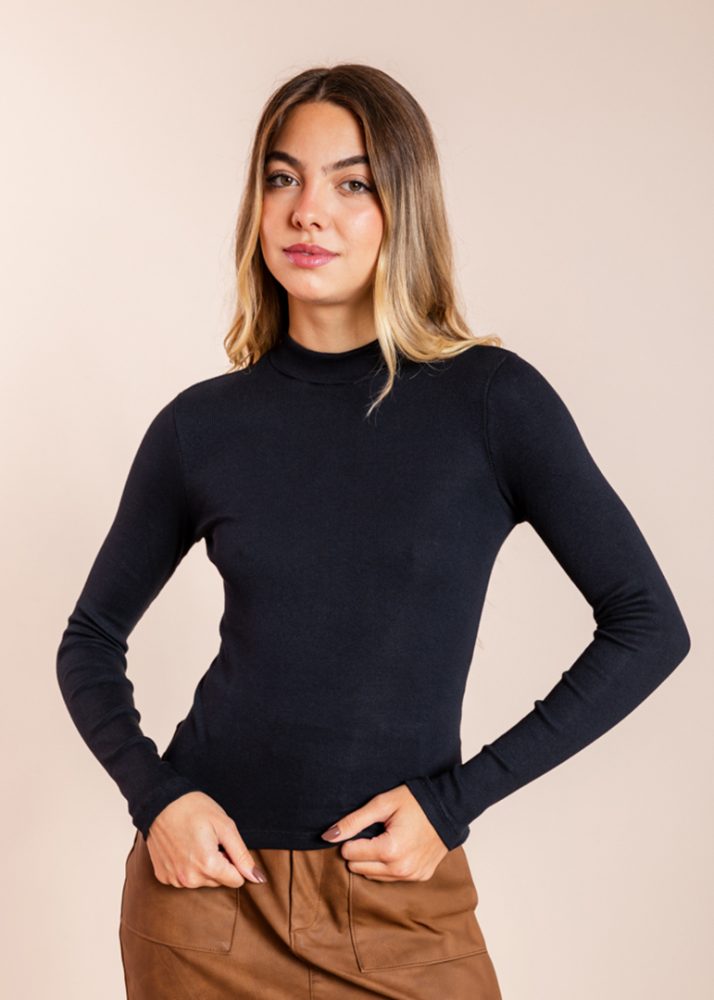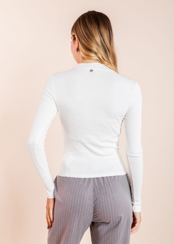 A modelagem é ajustada ao corpo com golinha alta e mangas longas que chegam até o pulso. Favorece diferentes biotipos e fica especialmente bonito com peças de cintura alta.
