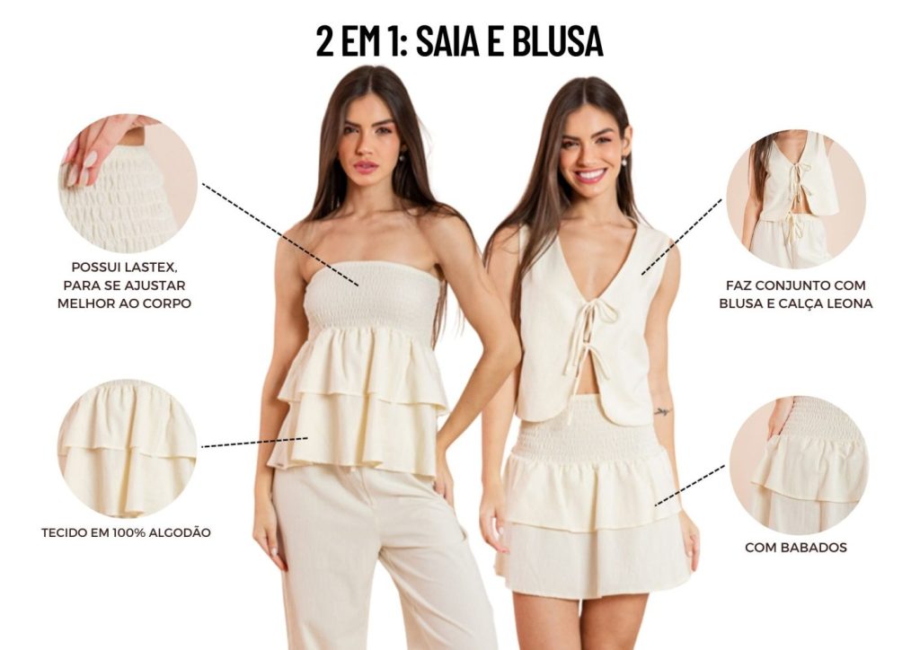 A Leona é aquela peça versátil que multiplica possibilidades no closet. Feita em algodão leve, ela tem lastex que garante ajuste perfeito ao corpo e babados delicados que trazem fluidez e movimento. O diferencial está na versatilidade: pode ser usada como saia, criando um look fresh e romântico, ou como blusa tomara que caia, para produções modernas e cheias de estilo. Com caimento confortável e atual, é perfeita para quem gosta de praticidade sem abrir mão do charme. Uma peça 2 em 1, prática, feminina e super atual — feita para transformar o guarda-roupa e acompanhar diferentes ocasiões.