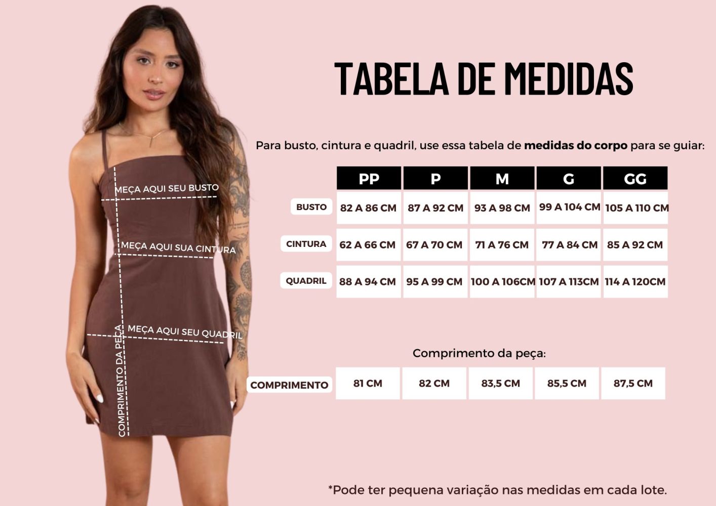 Medidas: Altura: 1,70m. Busto: 85cm Cintura: 68cm Quadril: 94cm.