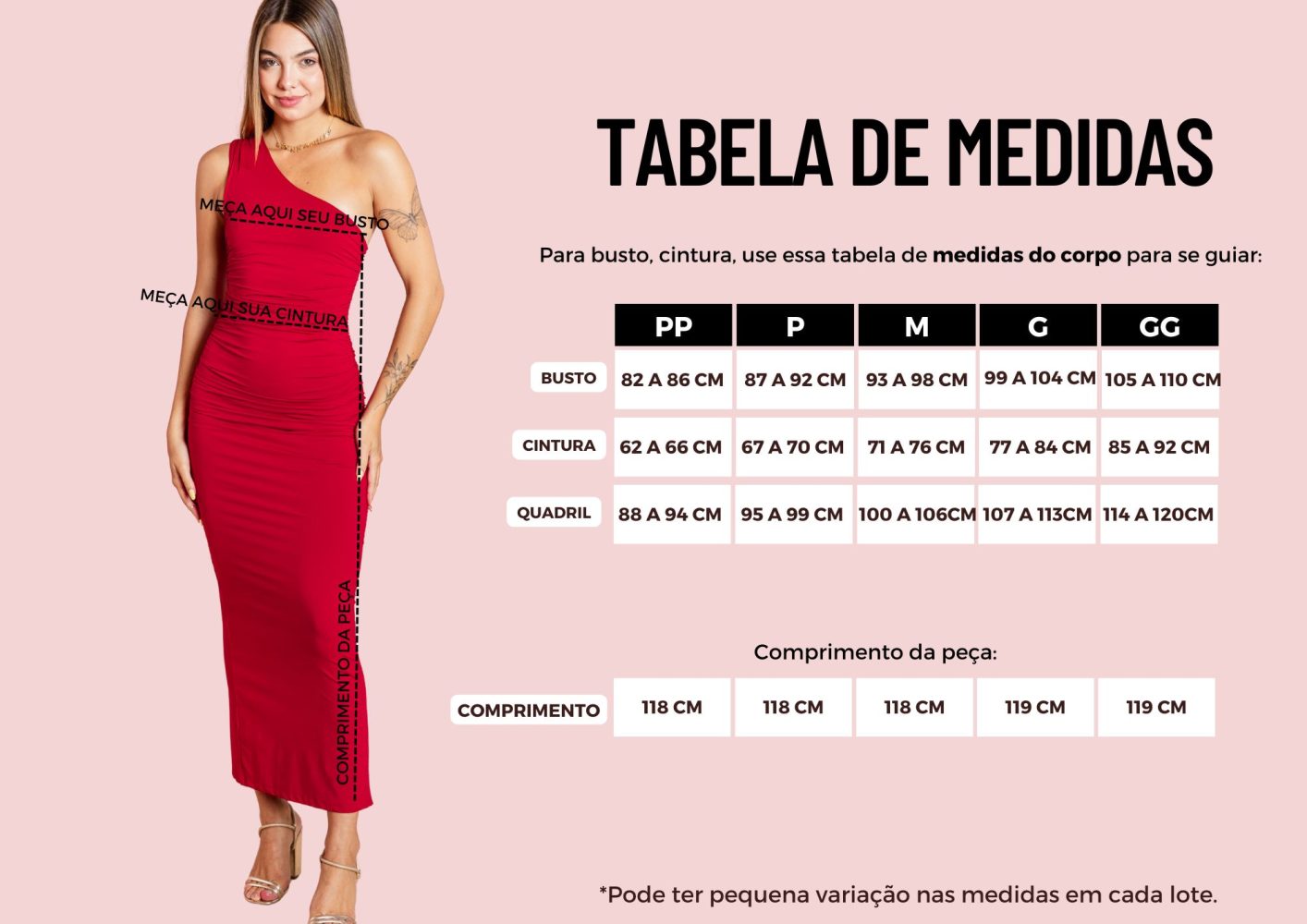 Medidas: Altura: 1,69m. Busto: 80cm Cintura: 64cm Quadril: 94cm.